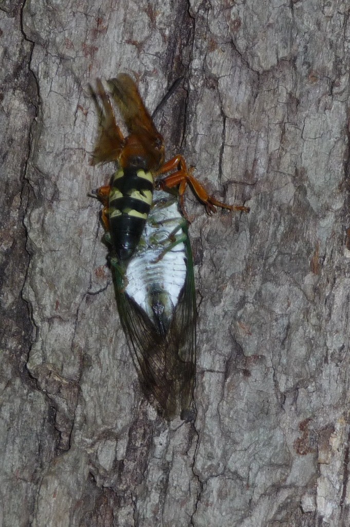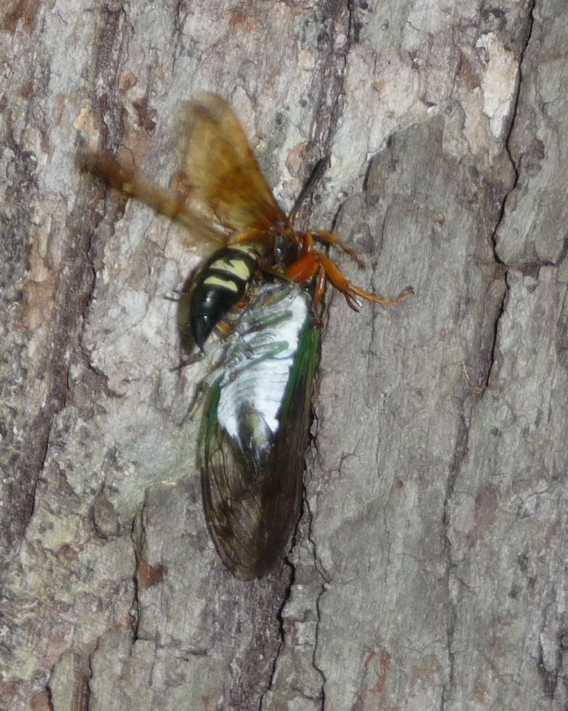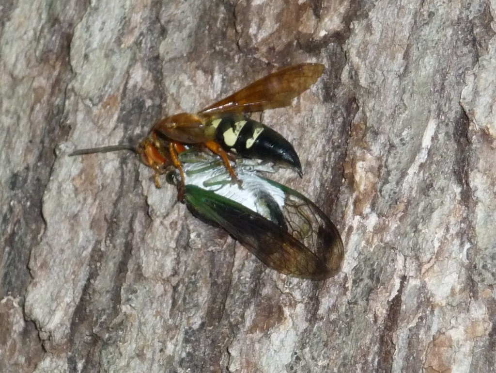 The pictures below show a cicada killer with a swamp cicada as its prey.