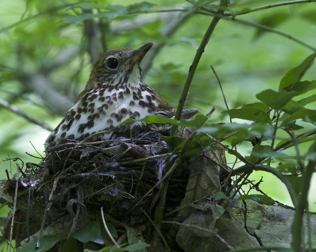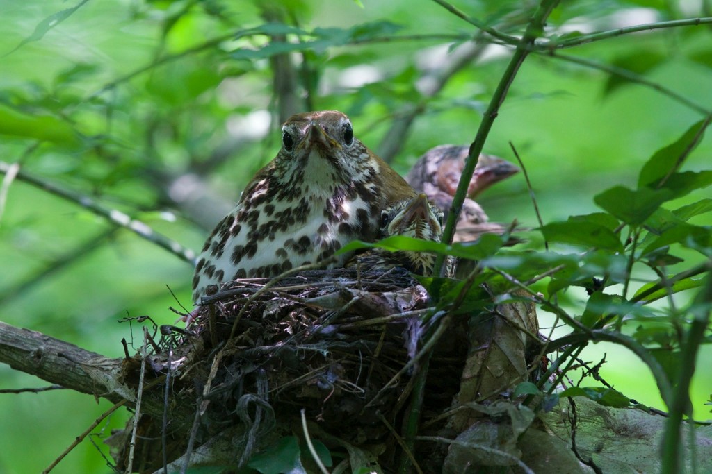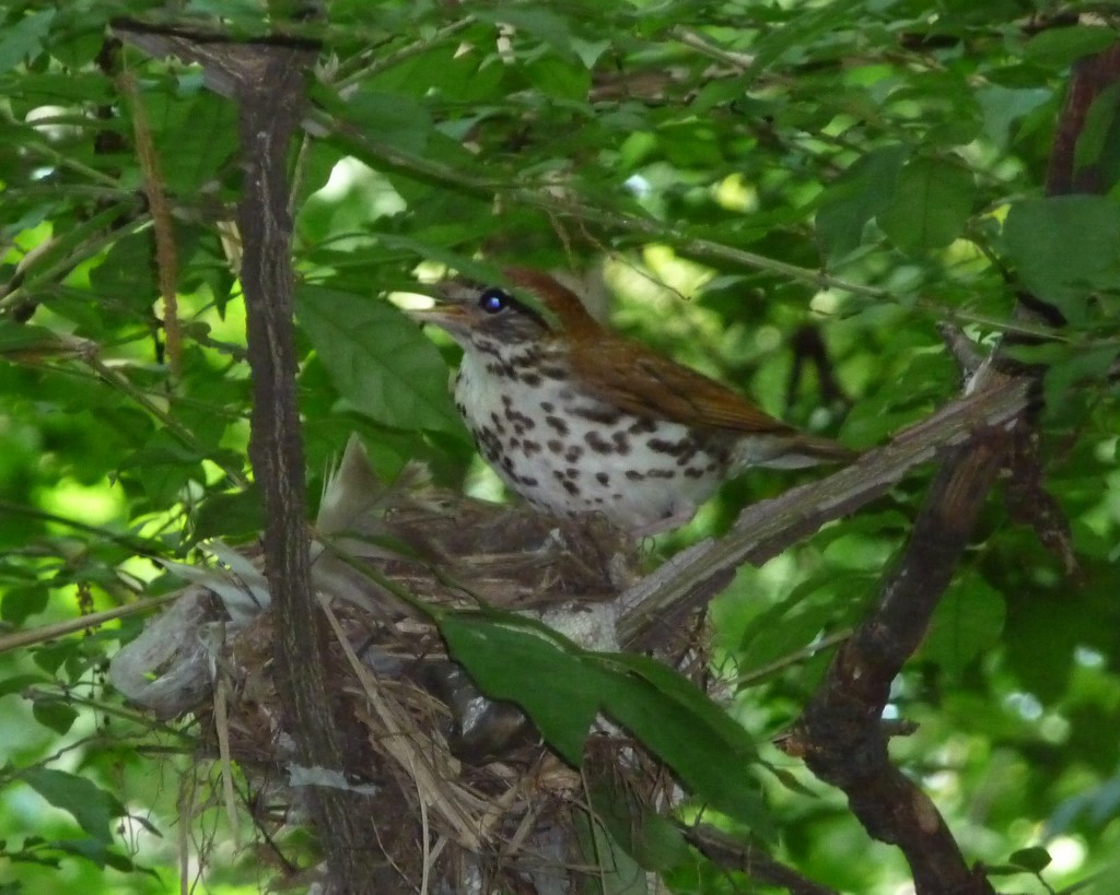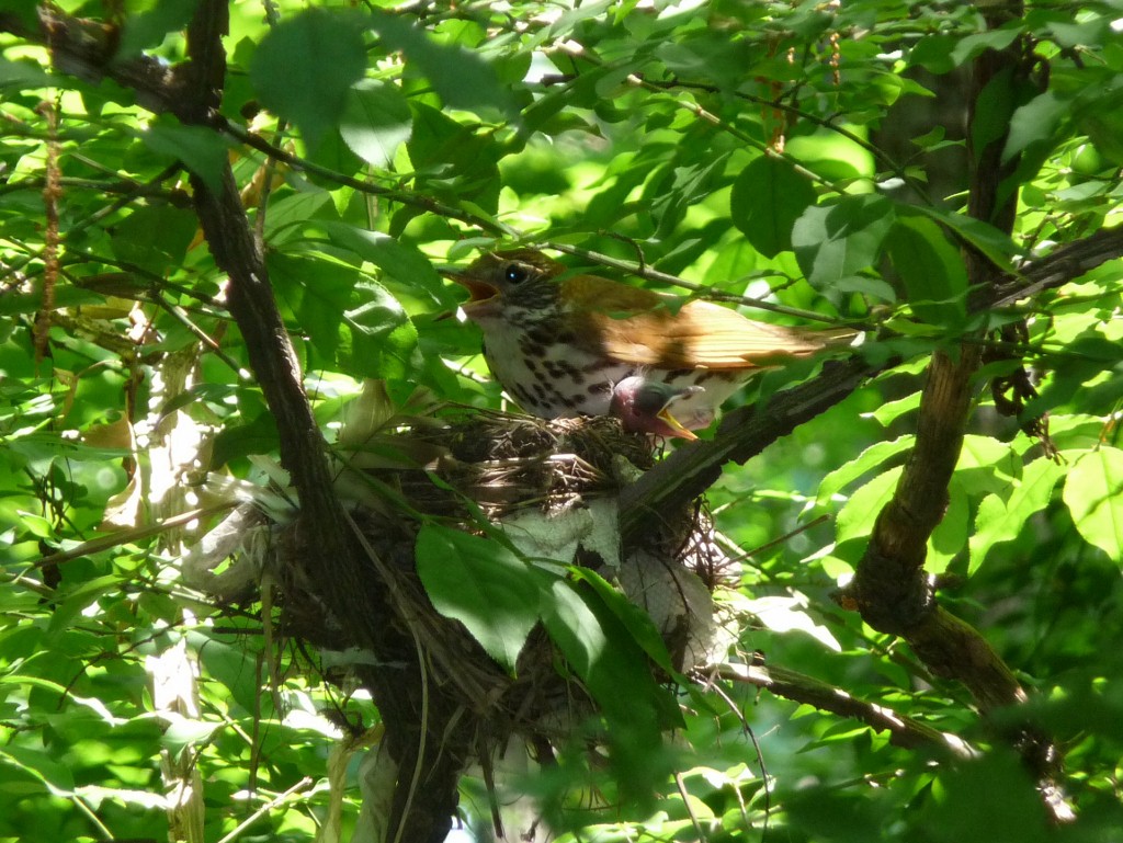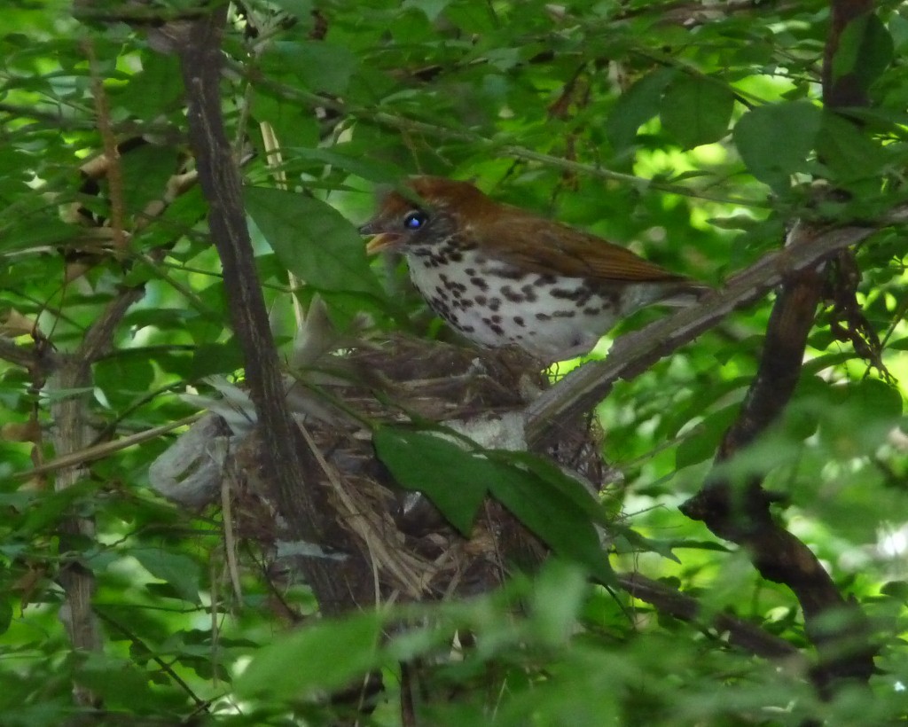 | June 11, 2015 Adult on nest with one tiny wood thrush tucked under its breast, barely visible behind a leaf |