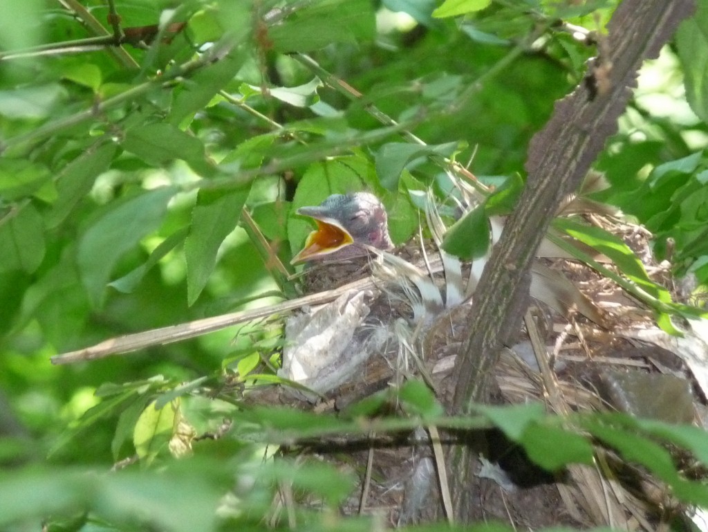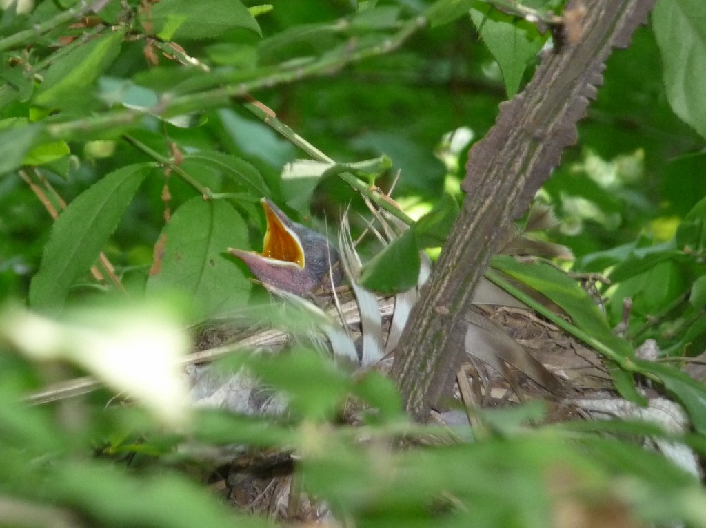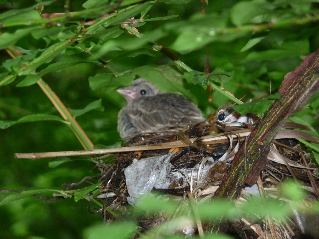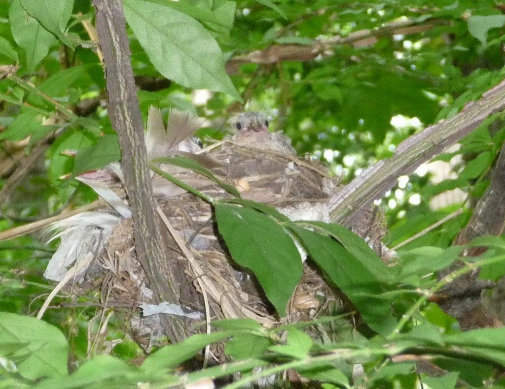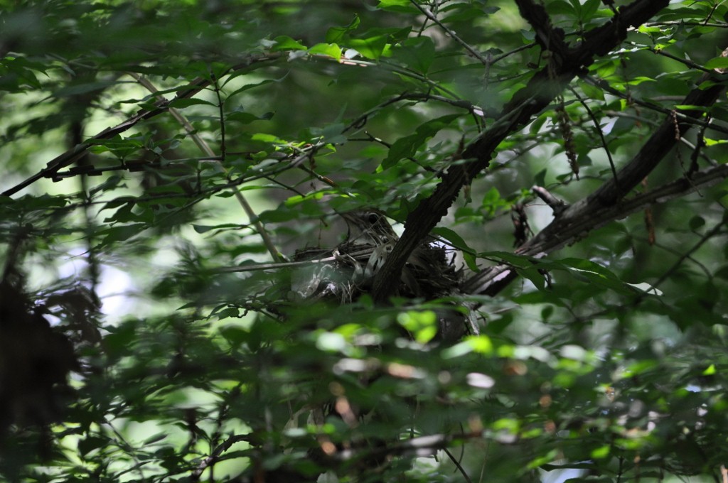 | June 11, 2015 Adult on nest with one tiny wood thrush tucked under its breast, barely visible behind a leaf |