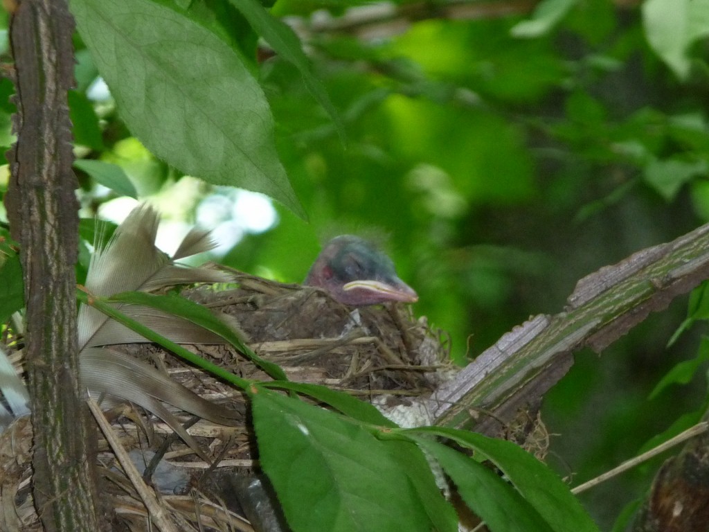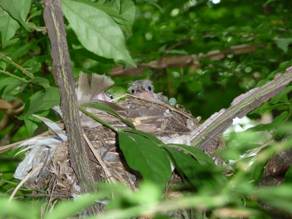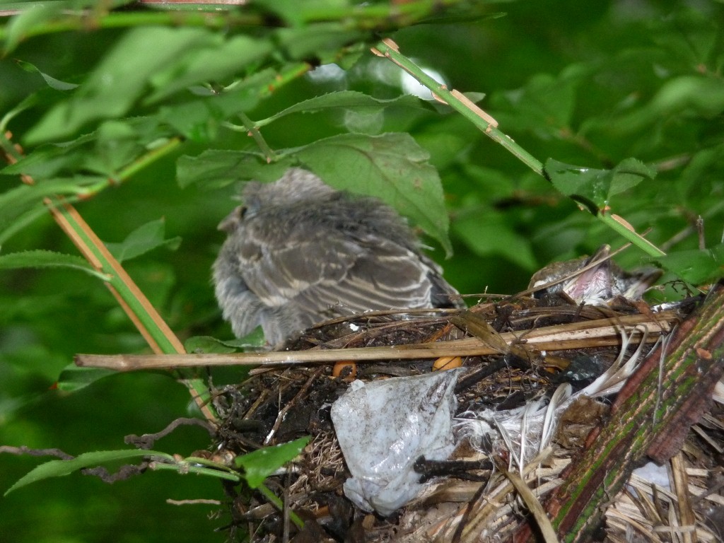 | June 11, 2015 Same nestling, same date, sitting up and more visible. It fledged the next day. |