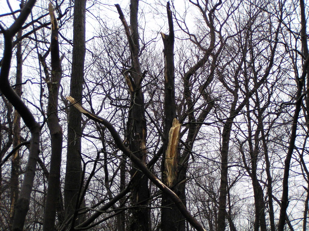 As the tree fell, it caused damage to smaller trees near it.
