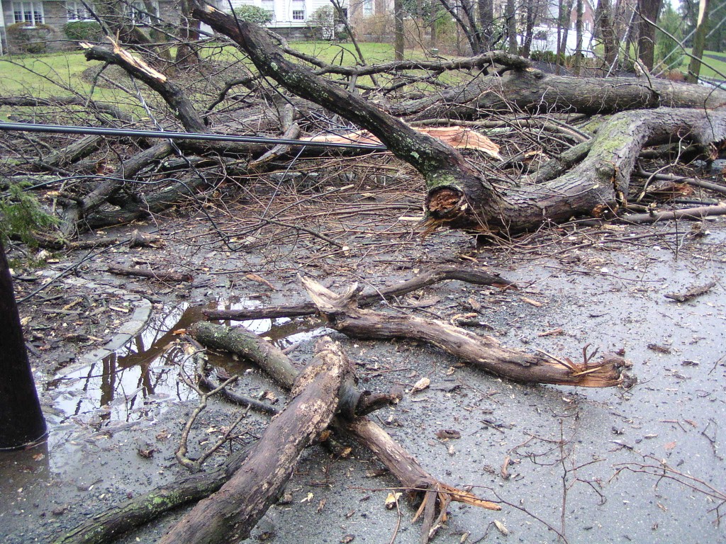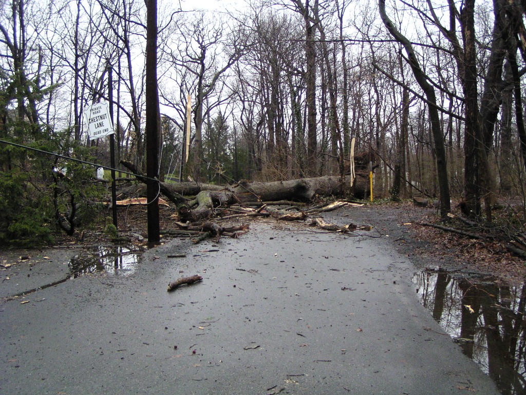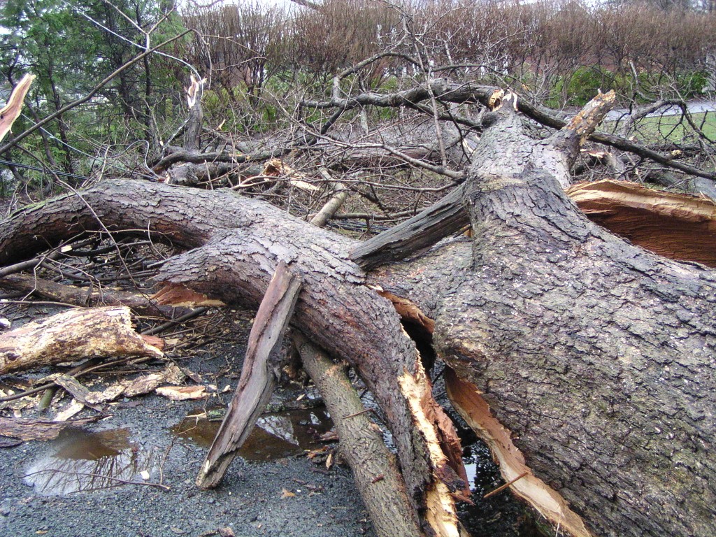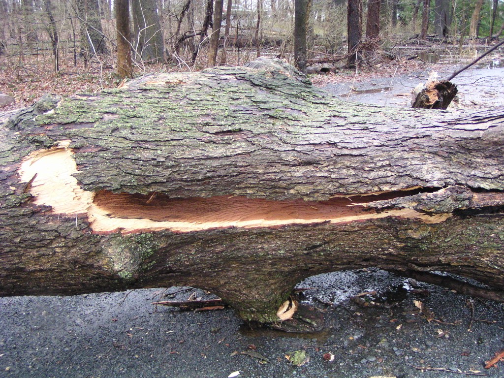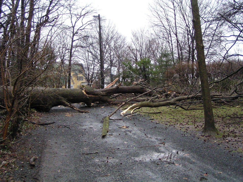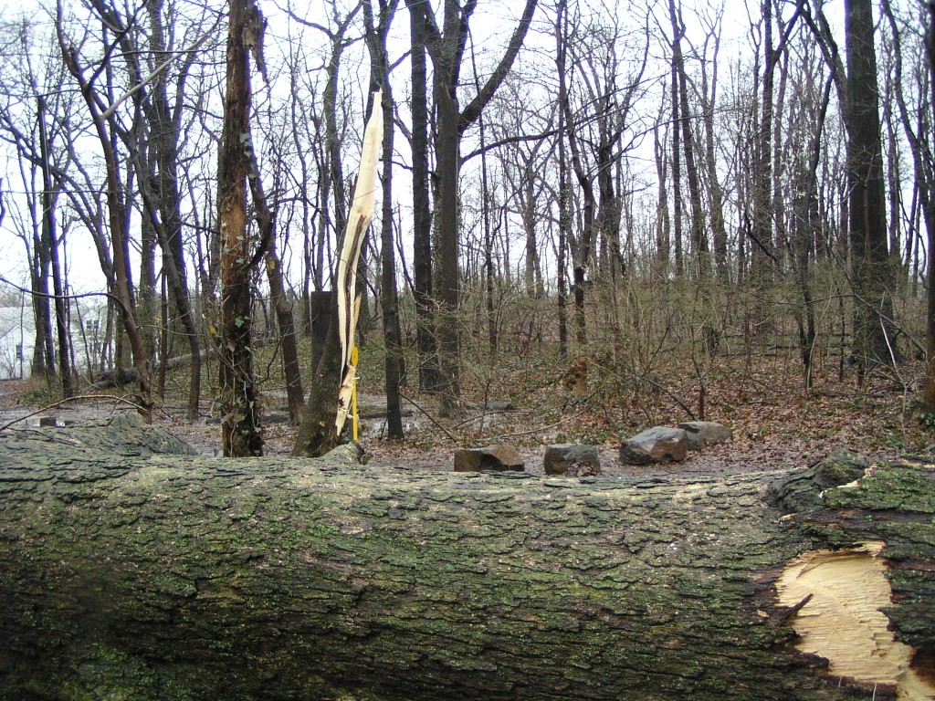 A fallen tree near the rear entrance of the park. The tree fell across Chestnut Avenue towards Chestnut Lane, and took down power lines. Judging by its size, this appears to have been one of the oldest trees in the park.