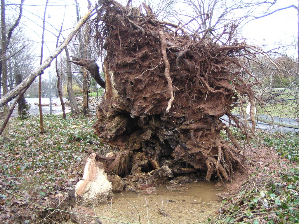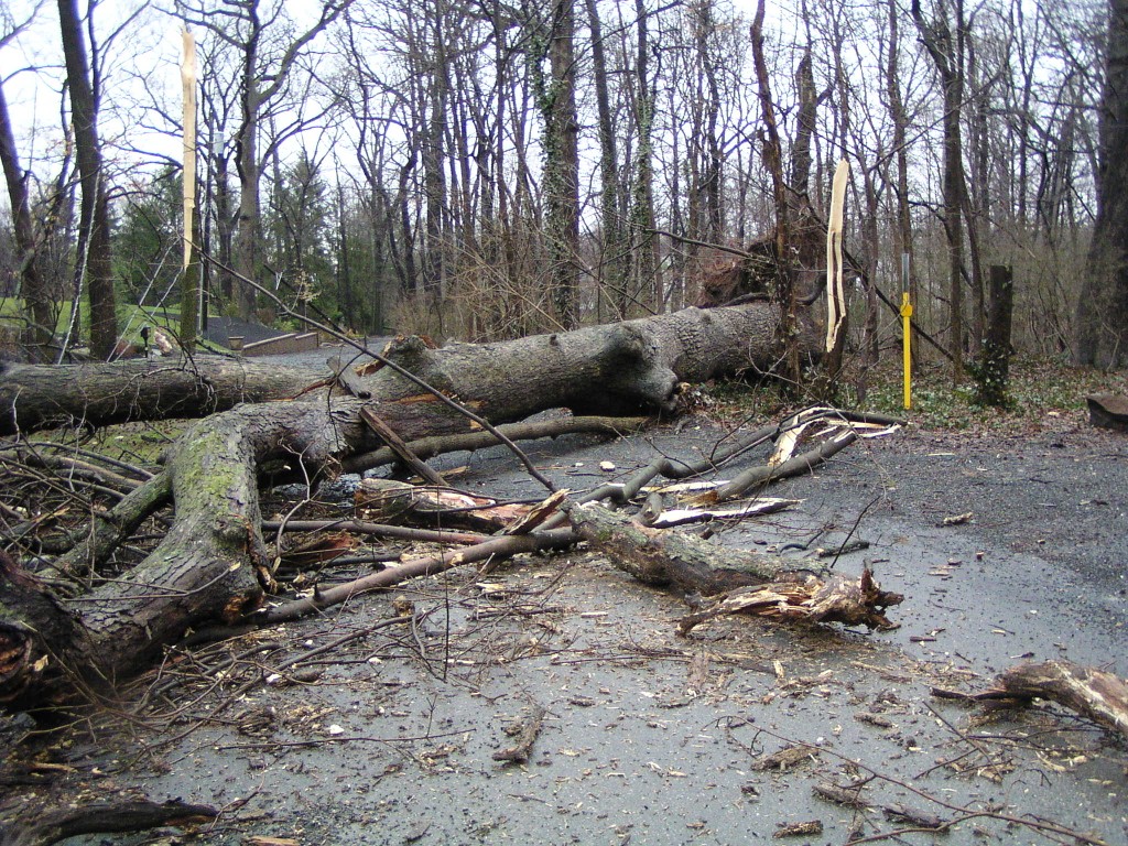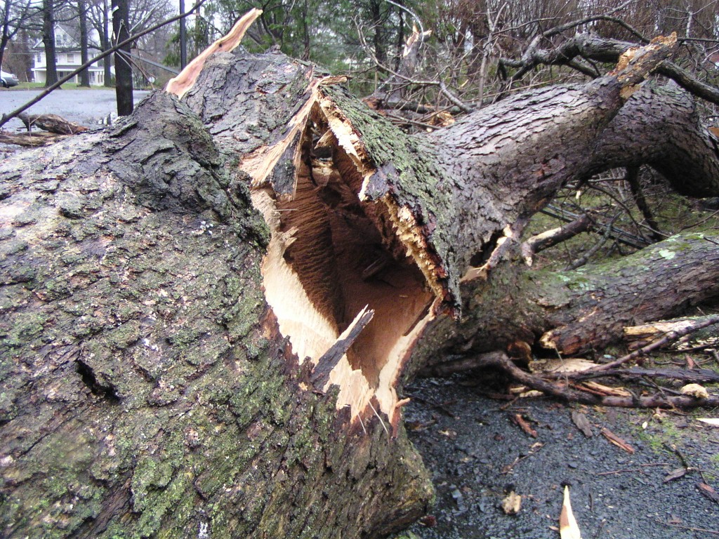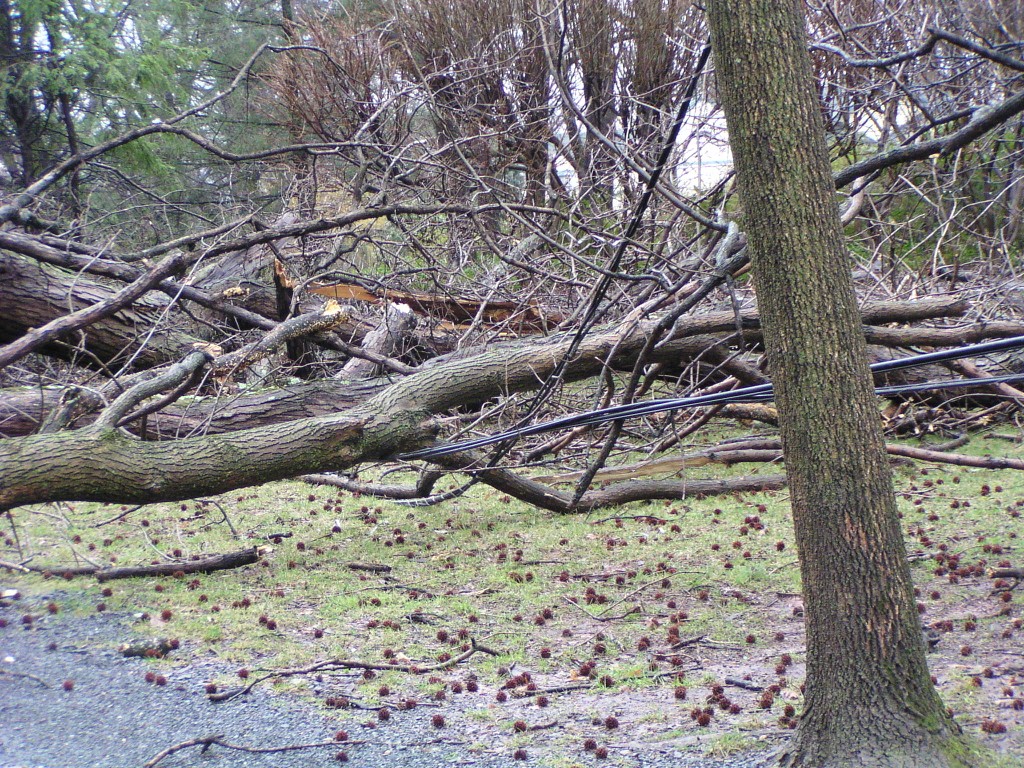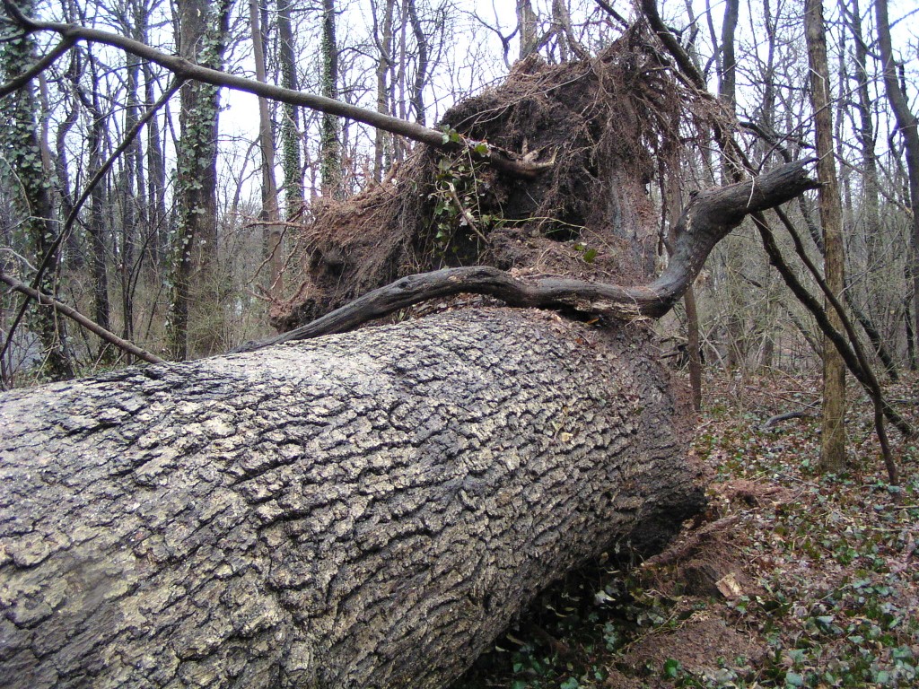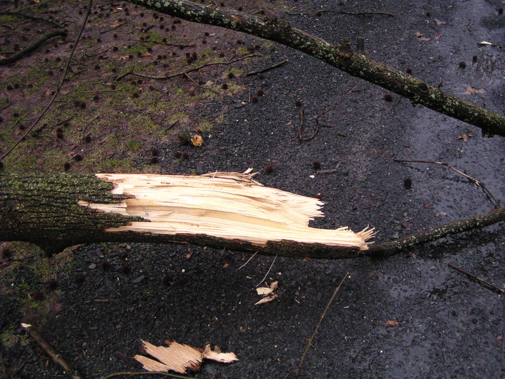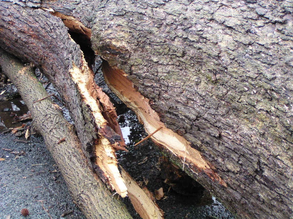 A fallen tree near the rear entrance of the park. The tree fell across Chestnut Avenue towards Chestnut Lane, and took down power lines. Judging by its size, this appears to have been one of the oldest trees in the park.