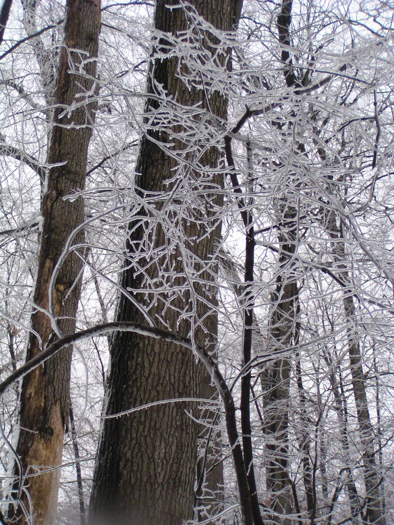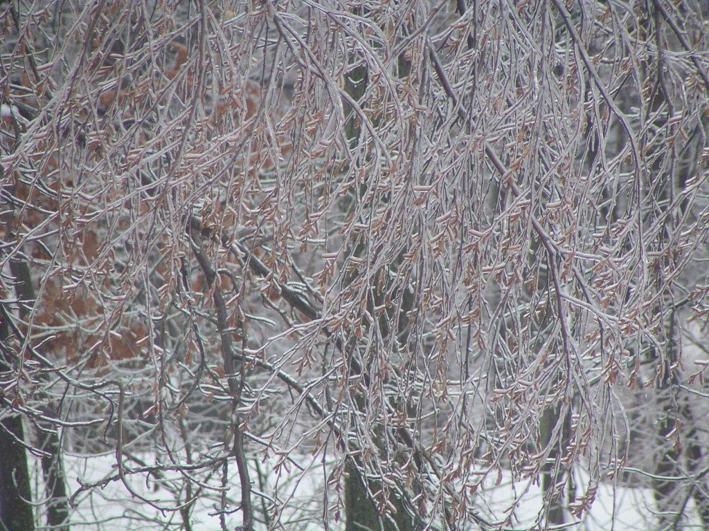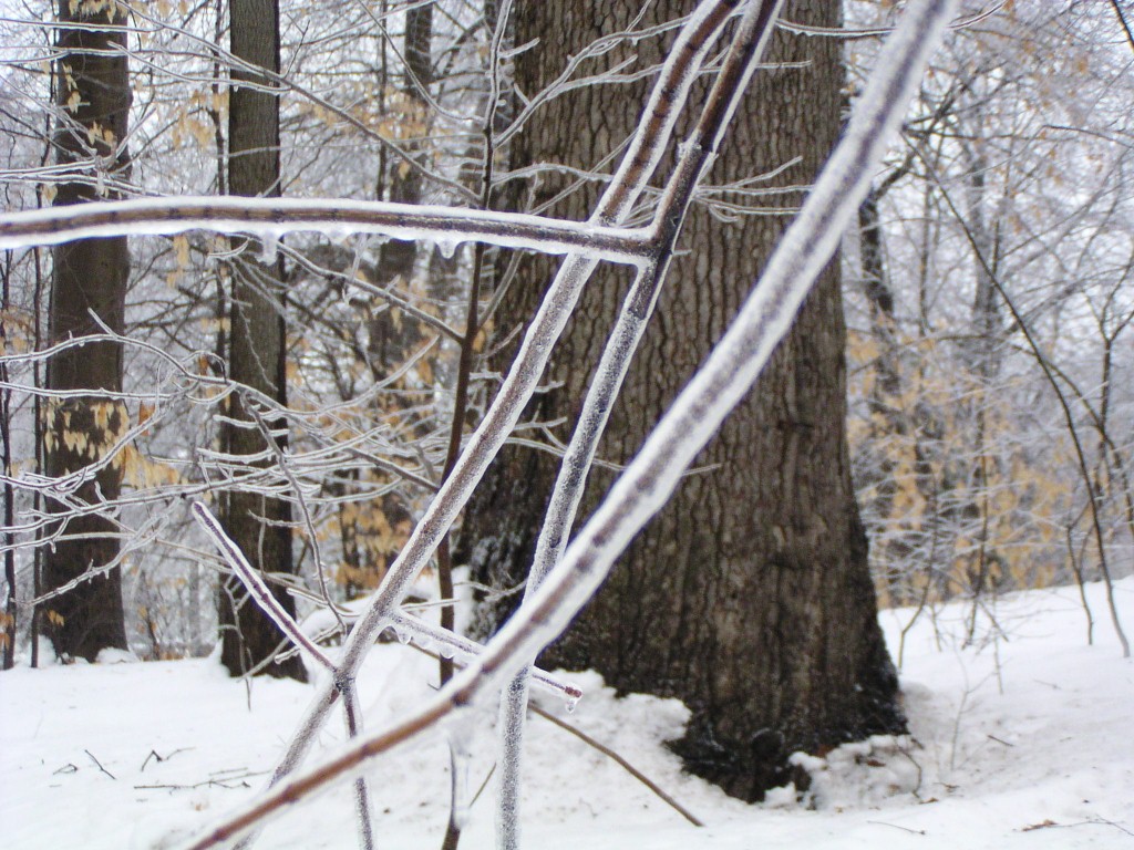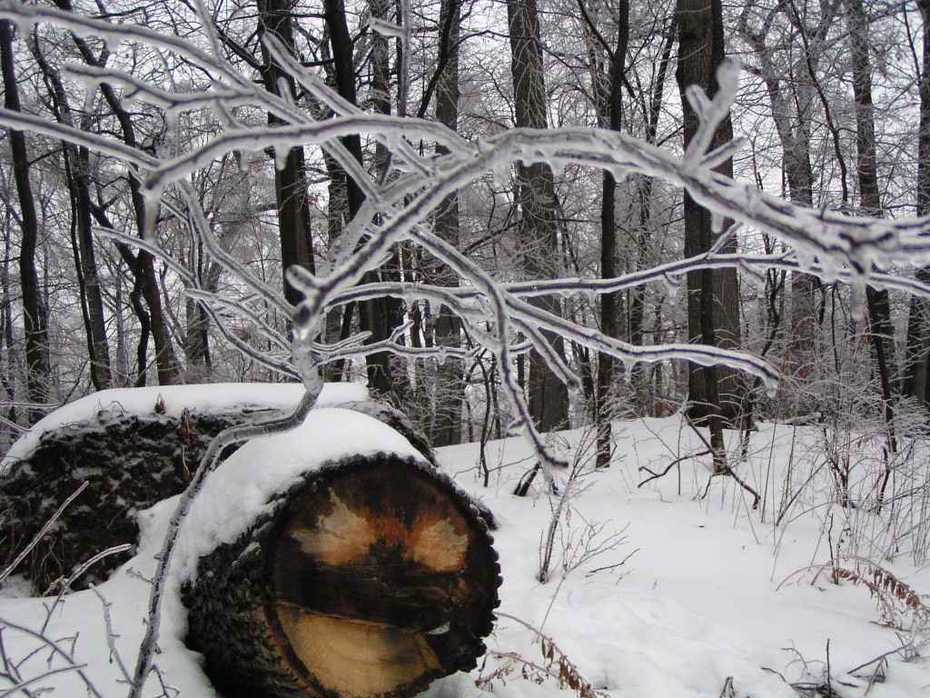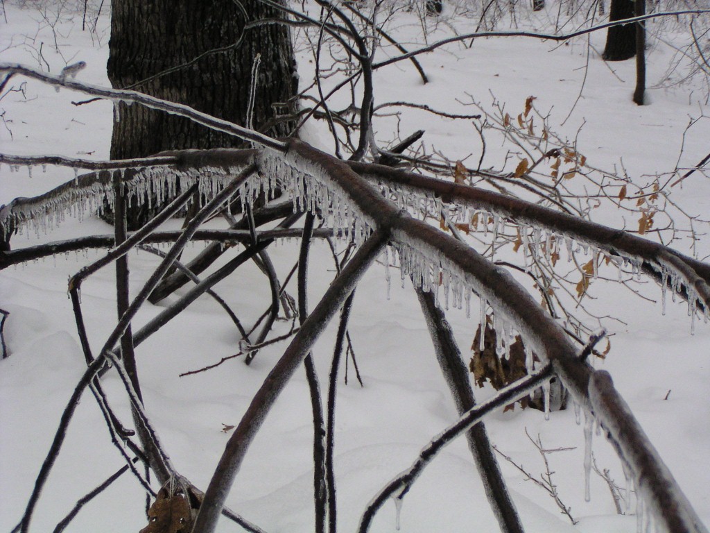 An ice storm with freezing rain and below-freezing temperatures passed through our area overnight and during the early morning hours on Groundhog Day, February 2, 2011. Tree branches were covered in a layer of ice. Temperatures reached above the freezing point in the day time. Falling ice could be seen and heard throughout the day, falling down from the treetops. The ground was still covered by a foot of snow from an earlier snow storm. The weight of the ice caused a few small branches to fall out of the trees, but otherwise the park sustained no damage.