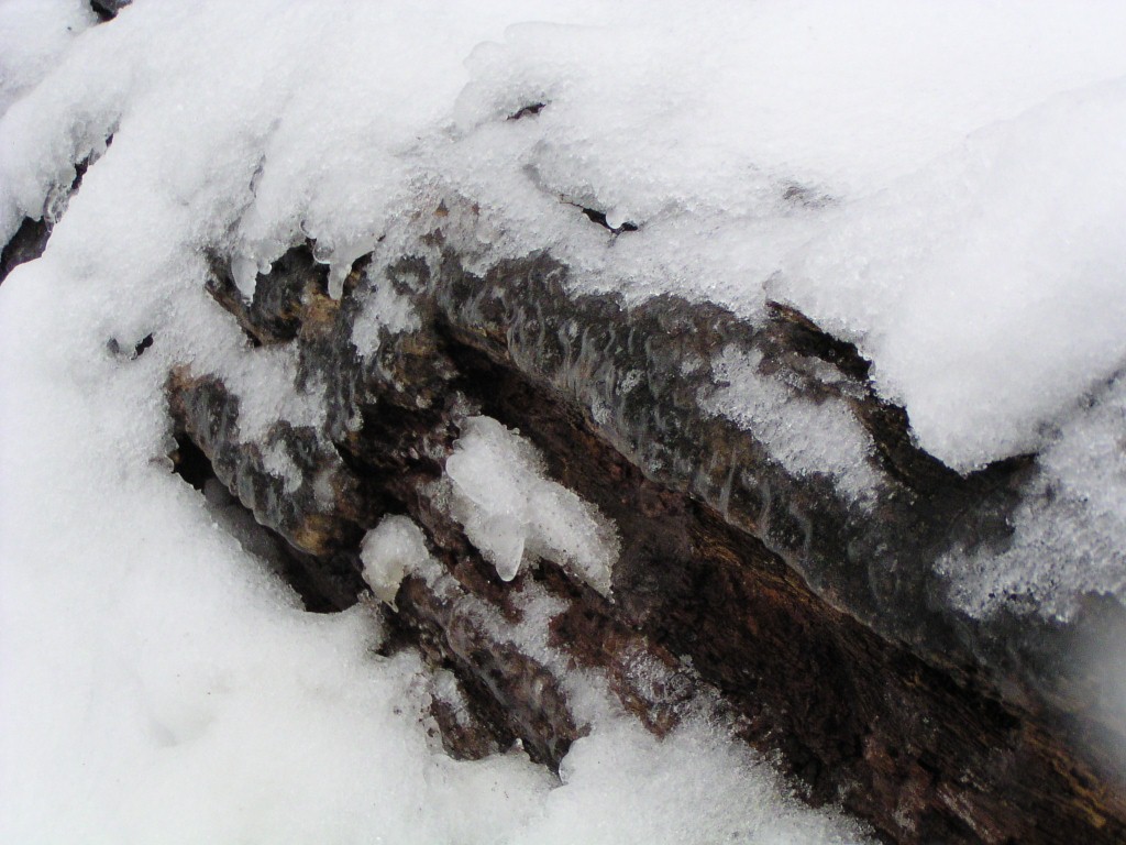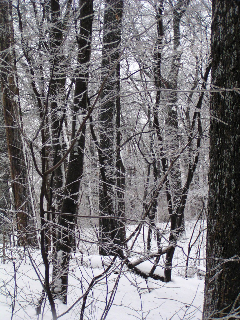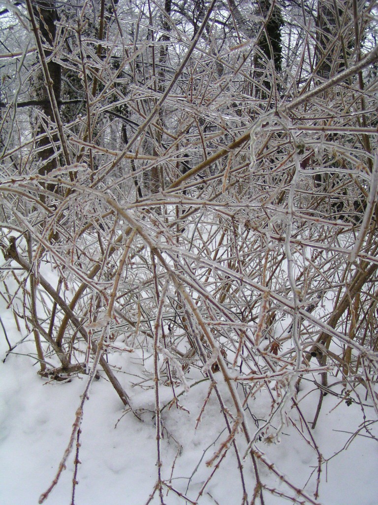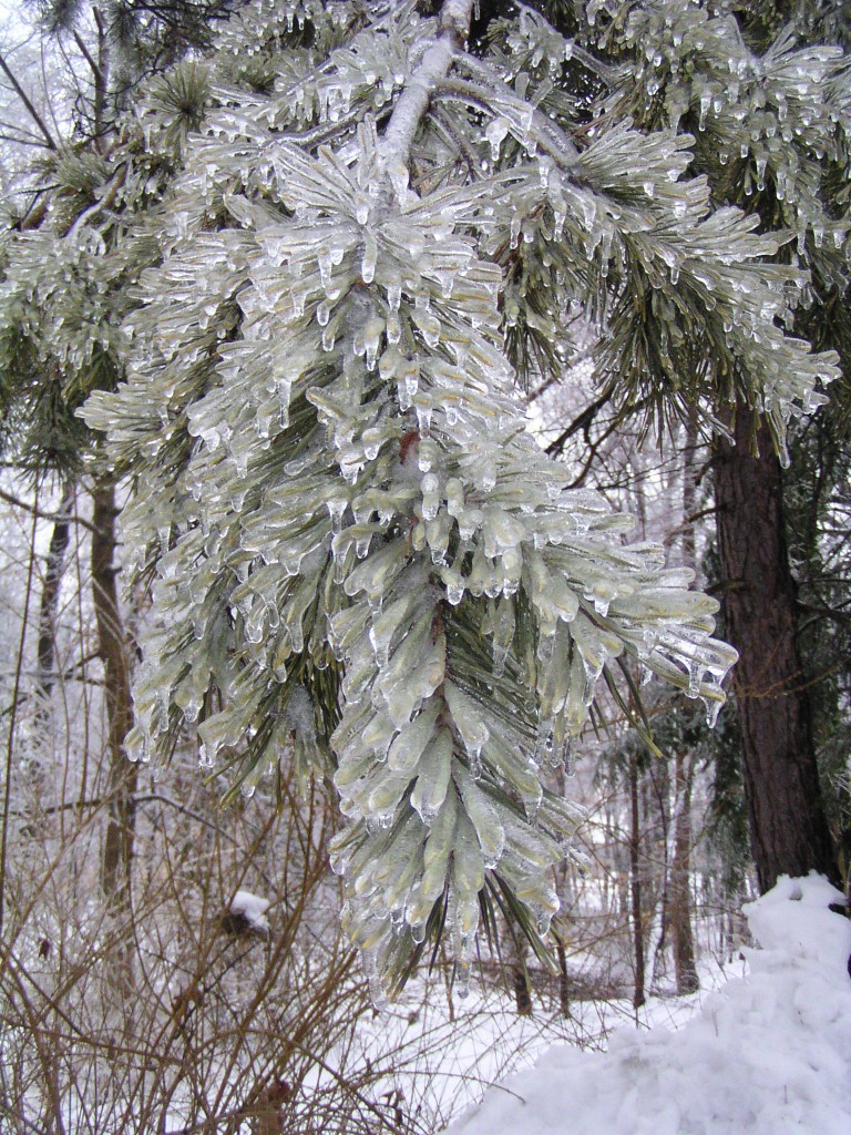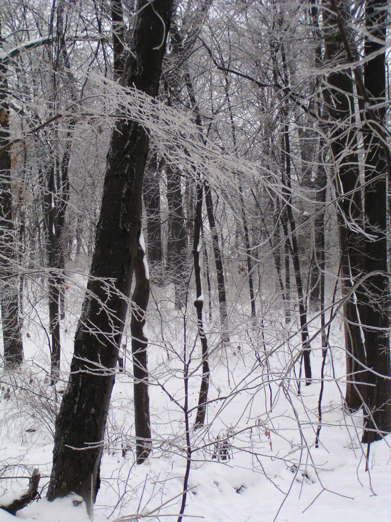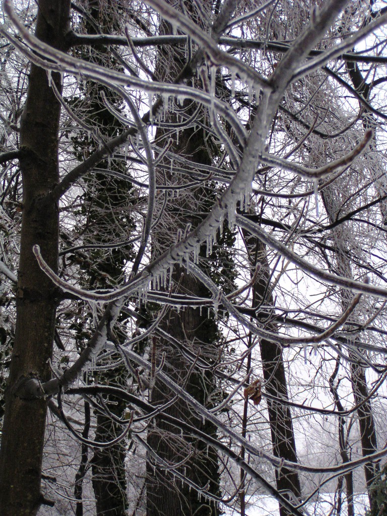 An ice storm with freezing rain and below-freezing temperatures passed through our area overnight and during the early morning hours on Groundhog Day, February 2, 2011. Tree branches were covered in a layer of ice. Temperatures reached above the freezing point in the day time. Falling ice could be seen and heard throughout the day, falling down from the treetops. The ground was still covered by a foot of snow from an earlier snow storm. The weight of the ice caused a few small branches to fall out of the trees, but otherwise the park sustained no damage.