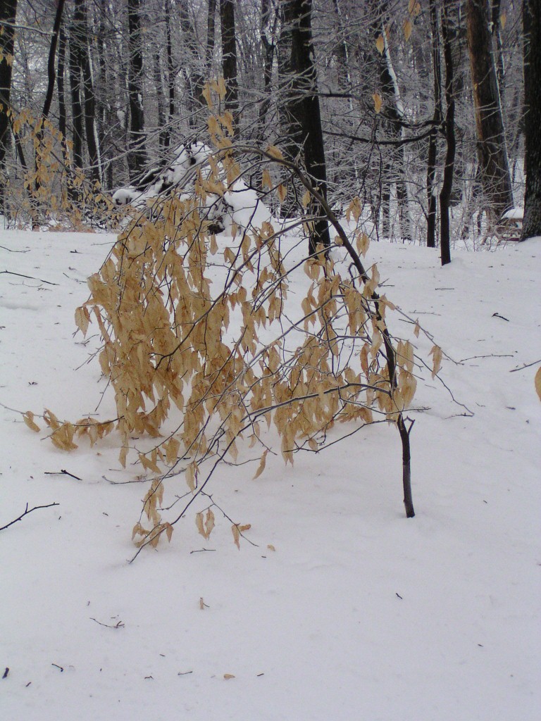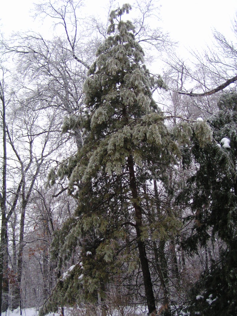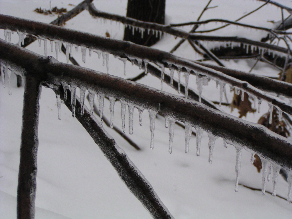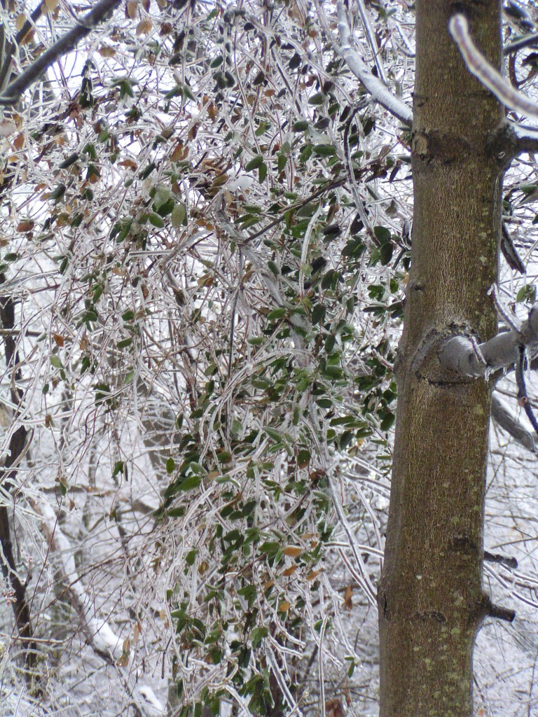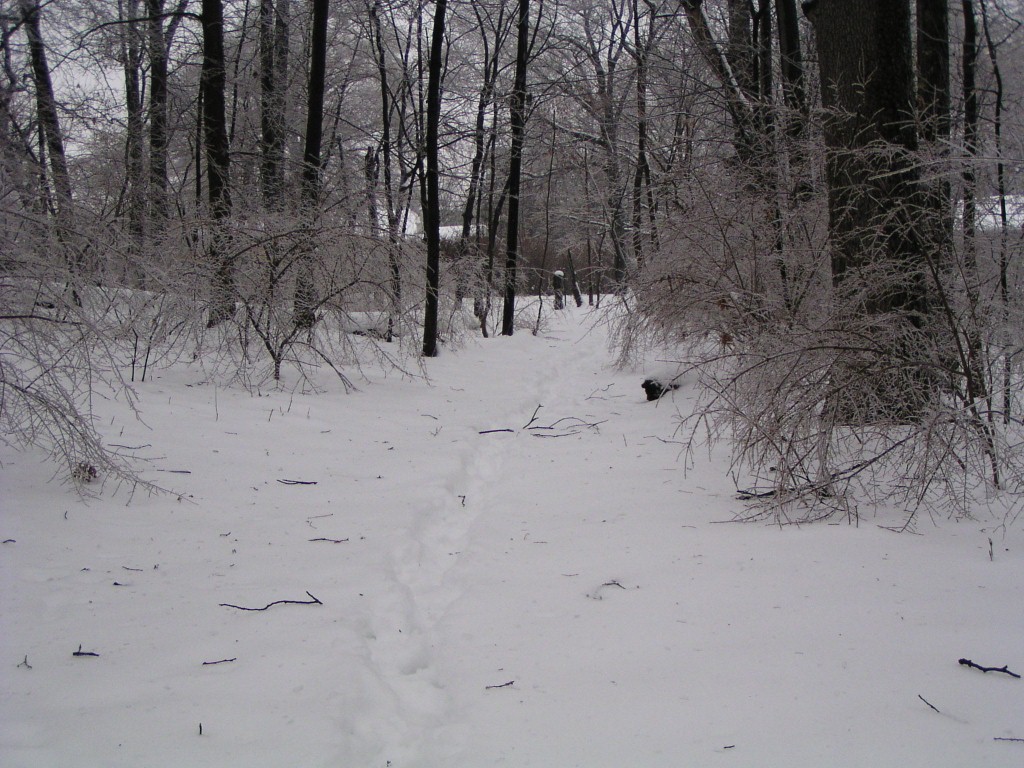 An ice storm with freezing rain and below-freezing temperatures passed through our area overnight and during the early morning hours on Groundhog Day, February 2, 2011. Tree branches were covered in a layer of ice. Temperatures reached above the freezing point in the day time. Falling ice could be seen and heard throughout the day, falling down from the treetops. The ground was still covered by a foot of snow from an earlier snow storm. The weight of the ice caused a few small branches to fall out of the trees, but otherwise the park sustained no damage.