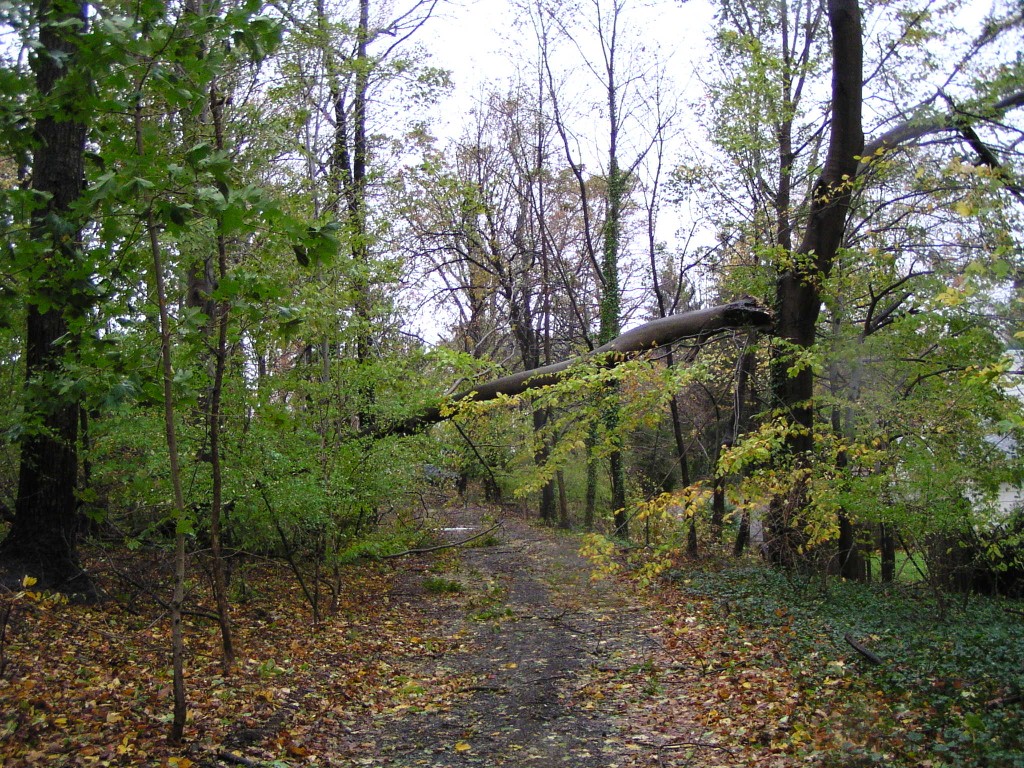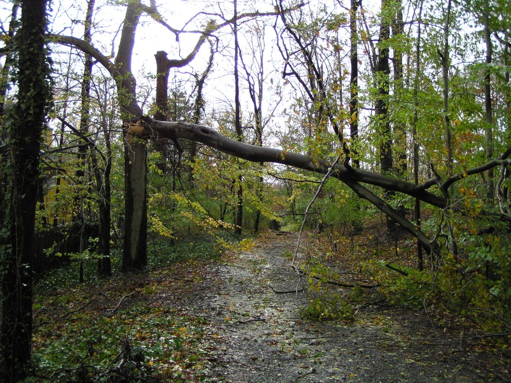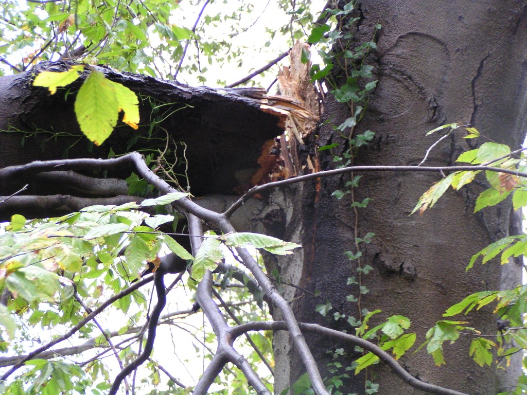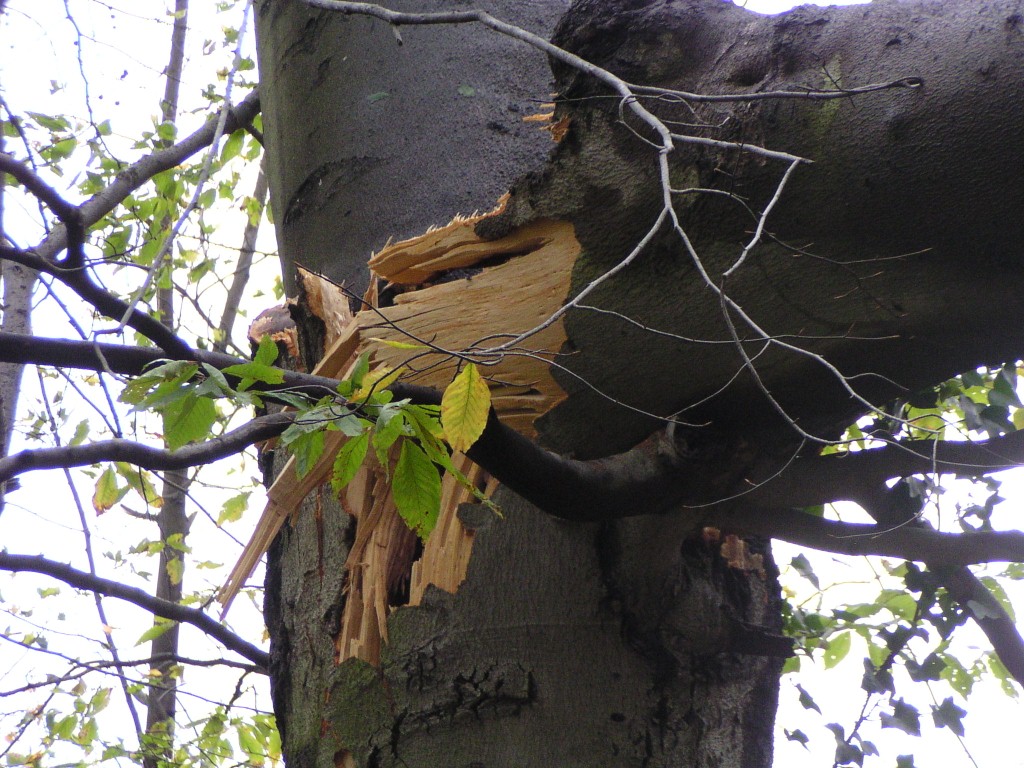 These pictures were taken after the storm, on October 30. They show one of the largest Beech trees in the park. About half the crown broke off the tree and rests on a small branch.
