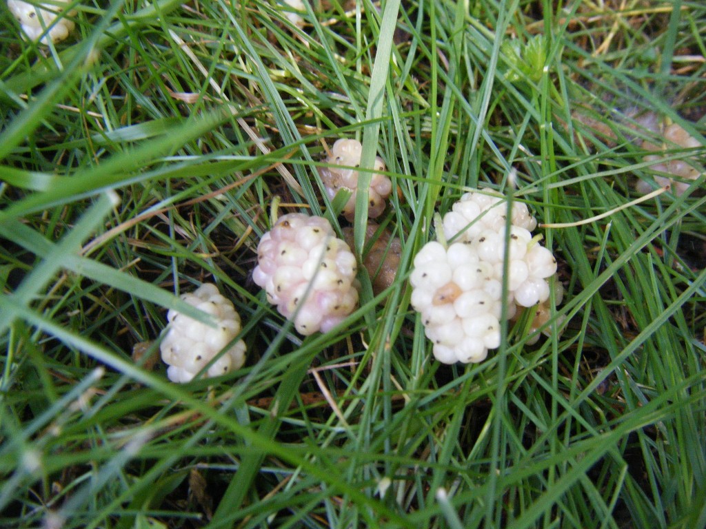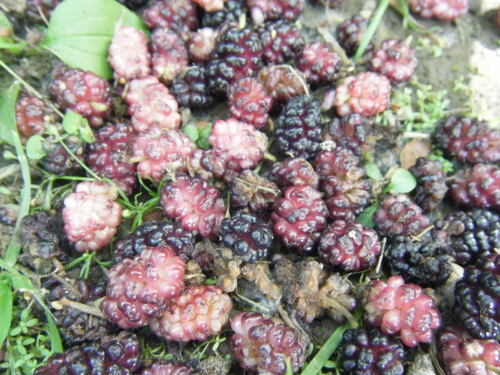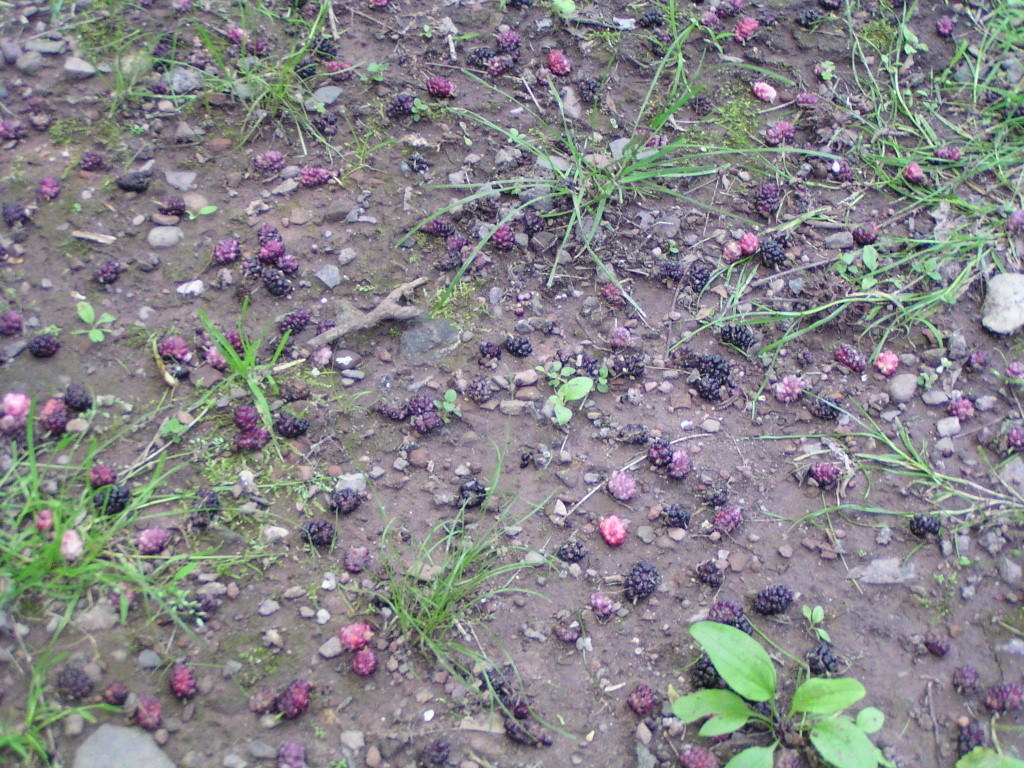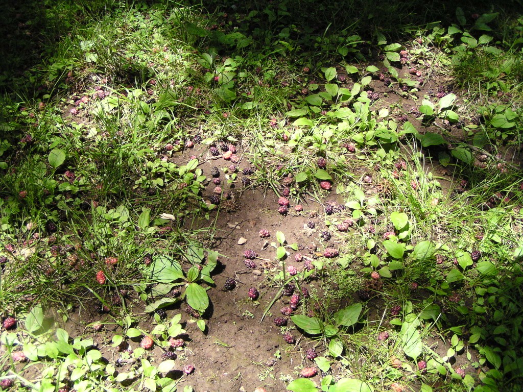 Two species of mulberry are common in our area: the red mulberry (Morus rubra) and the white mulberry (Morus alba). Both can be found in Woodwild Park. The berries are ripe and edible when they are soft. The ground underneath mature mulberry trees is usually littered with berries in early to mid June. For more information about mulberries, see, for example, the chapter on Mulberries in "Identifying and Harvesting Edible and Medicinal Plants in Wild (and Not-So-Wild) Places" by Steve Brill.